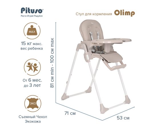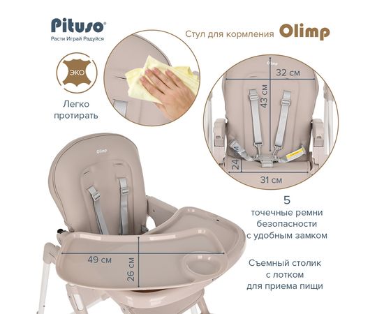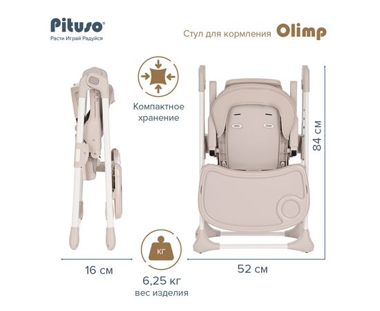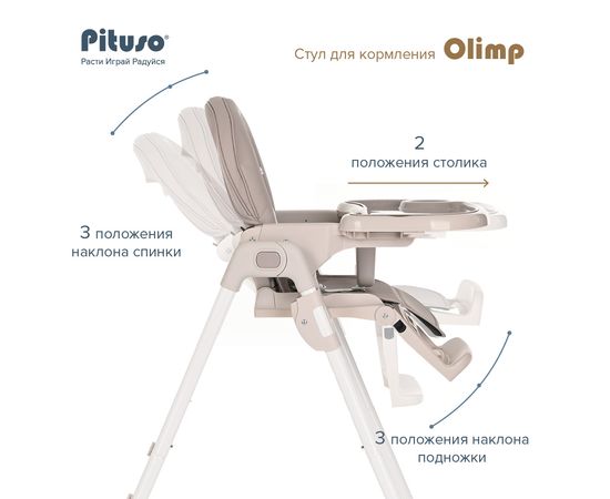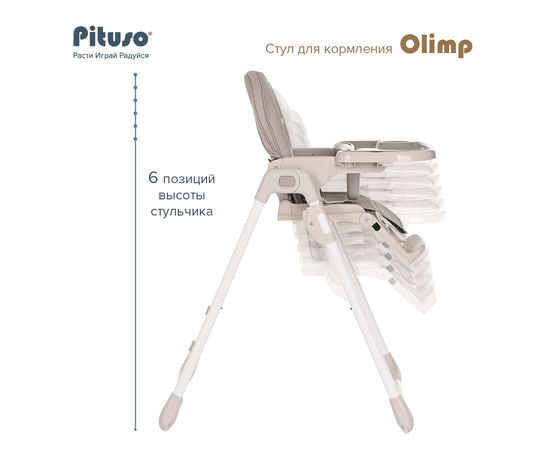 Стульчик Pituso OLIMP функциональный и удобный стульчик для кормления. Алюминиевая рама создает устойчивость и надежность, а задние колесики оснащены педалью тормоза. Безопасная конструкция с мягким сидением легко чистится и компактно складывается. Съемный столик подгоняется в наилучшее положение для кормления, а лоток для приема пищи легко моется. Высоту стульчика Pituso OLIMP можно настроить в 7 положениях. Пятиточечные страховочные ремни безопасности позволят весело проводить время с малышом, не опасаясь, что он вывалится наружу. Свободно регулируемый угол наклона спинки в 3-х положениях и 3-х ступенчатая регулировка подножки позволит ребенку сладко вздремнуть после приема пищи. Современная эргономичная форма прекрасно впишется в любой интерьер. Стульчик оснащен 2 колесиками на задних ножках. Отличительная особенность данной модели удобное и быстрое сложение одной кнопкой, модель очень компактная и удобная в быту, не занимает много места в сложенном виде, а с помощью колесиков легко перемещать по комнате.