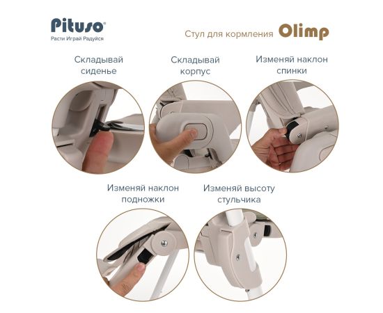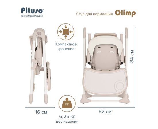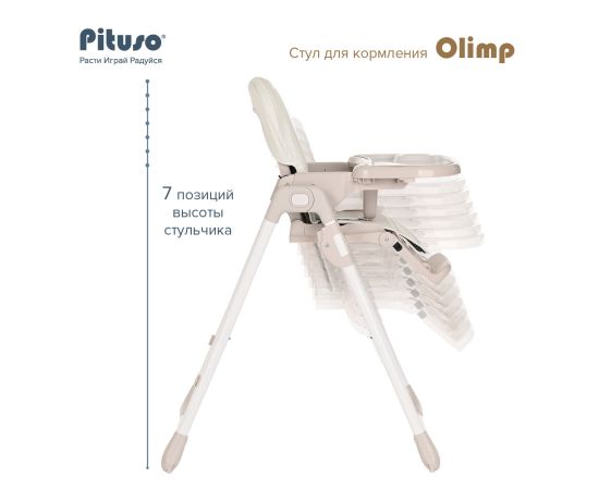 Стульчик Pituso OLIMP функциональный и удобный стульчик для кормления. Алюминиевая рама создает устойчивость и надежность, а задние колесики оснащены педалью тормоза. Безопасная конструкция с мягким сидением легко чистится и компактно складывается. Съемный столик подгоняется в наилучшее положение для кормления, а лоток для приема пищи легко моется. Высоту стульчика Pituso OLIMP можно настроить в 7 положениях. Пятиточечные страховочные ремни безопасности позволят весело проводить время с малышом, не опасаясь, что он вывалится наружу. Свободно регулируемый угол наклона спинки в 3-х положениях и 3-х ступенчатая регулировка подножки позволит ребенку сладко вздремнуть после приема пищи. Современная эргономичная форма прекрасно впишется в любой интерьер. Стульчик оснащен 2 колесиками на задних ножках. Отличительная особенность данной модели удобное и быстрое сложение одной кнопкой, модель очень компактная и удобная в быту, не занимает много места в сложенном виде, а с помощью колесиков легко перемещать по комнате.