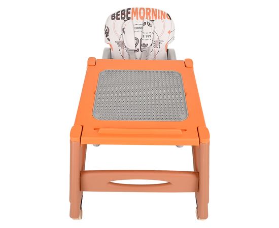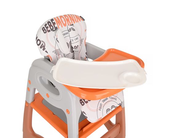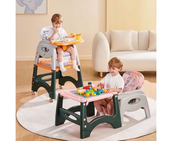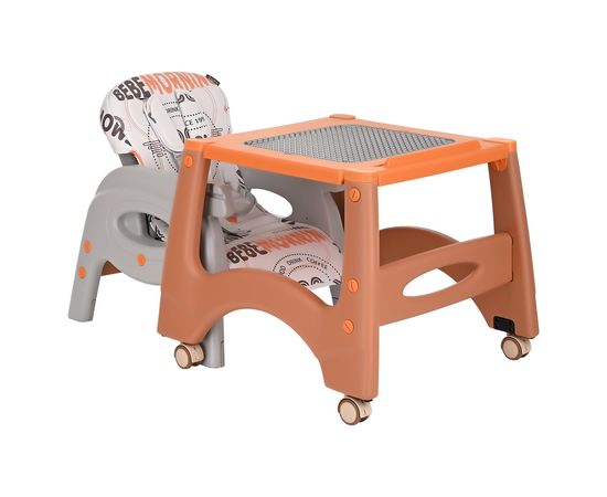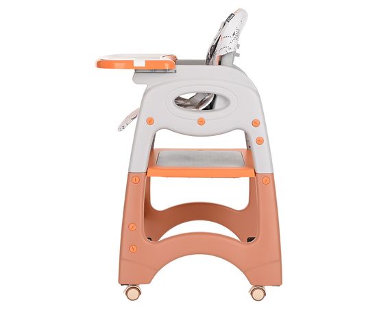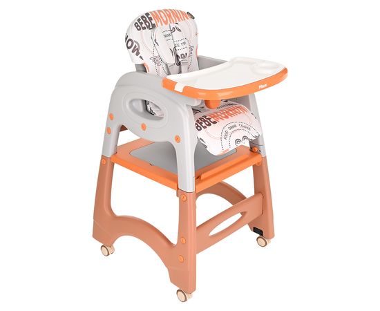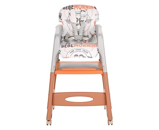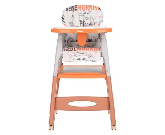 В собранном виде может быть высоким стульчиком для кормления со съемным регулируемым столиком и 5-точечными страховочными ремнями безопасности.