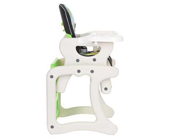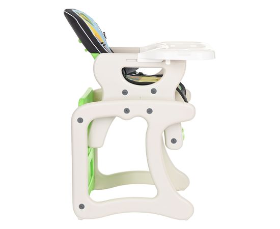 В собранном виде может быть высоким стульчиком для кормления со съемным регулируемым столиком и 5-точечными страховочными ремнями безопасности. Спинка стула регулируется, что позволяет ребенку вздремнуть после сытной трапезы. Трансформируется в отдельную комбинацию – стол + стул, за которым Вашему малышу будет интересно играть и заниматься творчеством.
