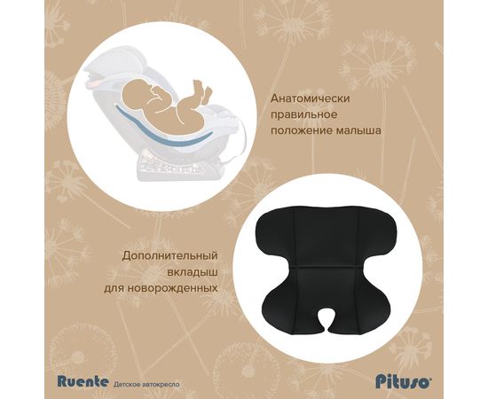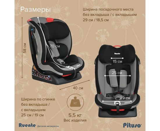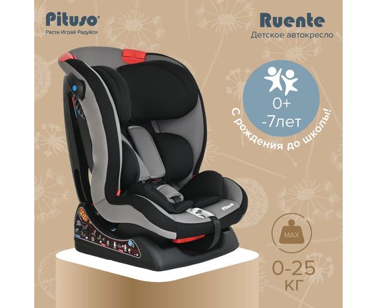 Детское автомобильное кресло Pituso Ruente предназначено для детей от рождения до 7 лет весом до 25 кг. Одним из отличительных свойств автокресла является его универсальность. Его можно использовать с момента рождения малыша до того, как ребенок пойдет в школу. Благодаря ортопедической форме спинки и регулировки наклона автокресла, мягкому вкладышу и накладкам внутренних ремней безопасности ребенку удобно и комфортно в поездке. Внутренние пятиточечные ремни регулируются по высоте в зависимости от роста ребенка. В детском автомобильном кресле ваш ребенок будет путешествовать в безопасности и с удовольствием!