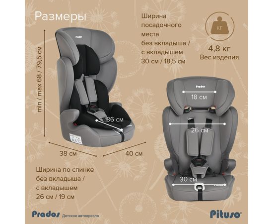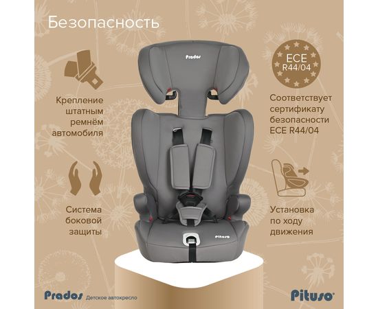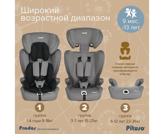 Детское автомобильное кресло Pituso Prados предназначено для детей от 1 года до 12 лет весом от 9 до 36 кг. Отличительным свойством автокресла является его универсальность: по мере роста ребенка, кресло легко трансформируется в бустер. Кресло имеет мягкий подголовник и съемный чехол.