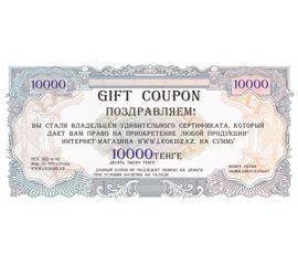 Подарочный сертификат на сумму 10000 тенге. Отличный вариант для подарка! Наличные деньги дарить не модно, модно дарить подарочные сертификаты! Выбор подарка будет по желанию и по надобности! Такой подарок будет очень актуален, когда хочется совершить глобальную покупку! Если все друзья...