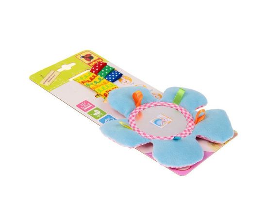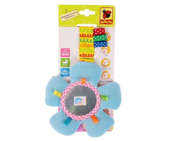 Яркая игрушка развивает у малыша цветовосприятие, тактильные ощущения, координацию движений, воображение, мелкую моторику и слух. Ребёнок с удовольствием будет изучать вещицу, ведь в ней так много интересного: забавное зеркальце, шелестящие лепестки и петельки разной фактуры.