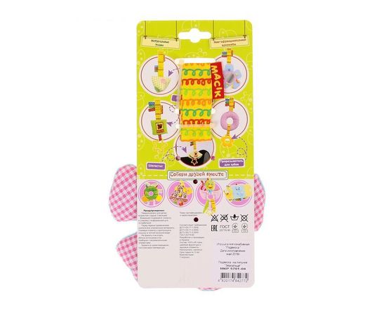Изделие можно зафиксировать на кроватке, коляске, детском манеже или автокресле. Оно имеет универсальное крепление-липучку. Игрушка выполнена из мягкой ткани, подходит для ручной стирки.