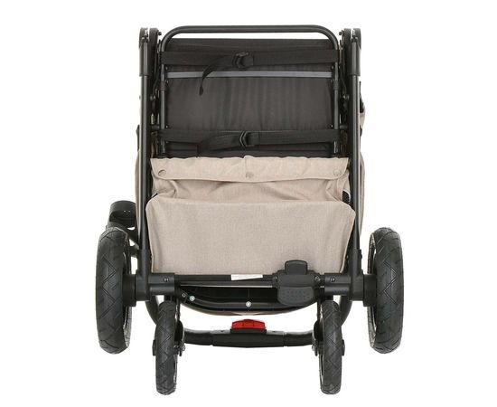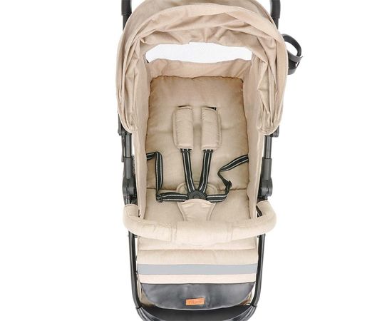 В ней удачно сочетаются продуманность всех деталей и современный дизайн. Регулировка спинки осуществляется при помощи натяжных ремней. Капор бесшумно регулируется, его объем увеличивается благодаря дополнительной секции на молнии. В раскрытом состоянии капор практически полностью закрывает верхнюю часть коляски.