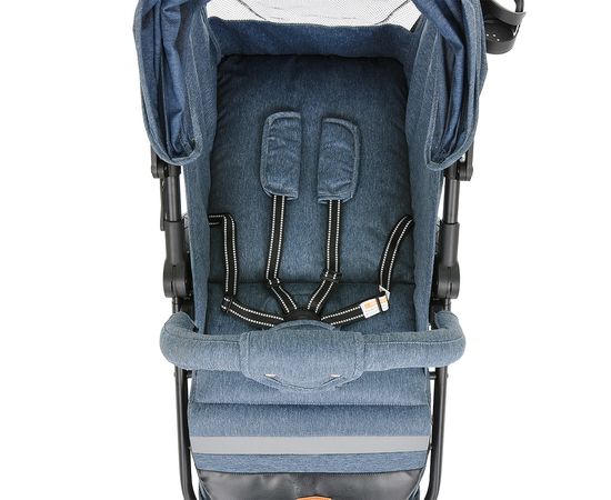 В ней удачно сочетаются продуманность всех деталей и современный дизайн. Регулировка спинки осуществляется при помощи натяжных ремней. Капор бесшумно регулируется, его объем увеличивается благодаря дополнительной секции на молнии. В раскрытом состоянии капор практически полностью закрывает верхнюю часть коляски.