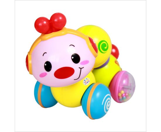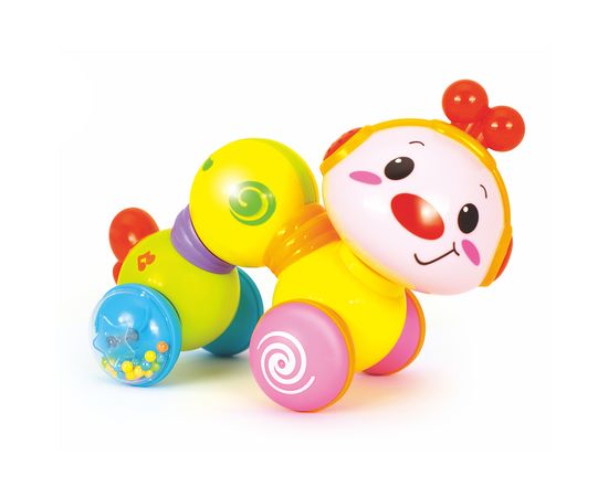 Нажатие на центр гусенички приводит ее в движение и стимулирует малыша ползти вслед за ней, что способствует развитию двигательной функции и координации движения