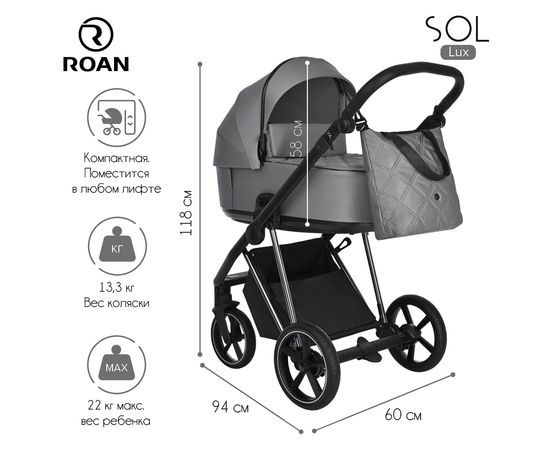 Многофункциональная модульная коляска Roan Sol Lux– это детская коляска высокого качества в идеальном исполнении, которое заметно с первого взгляда.