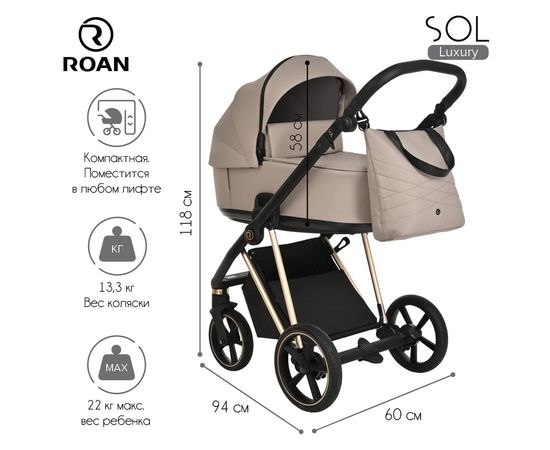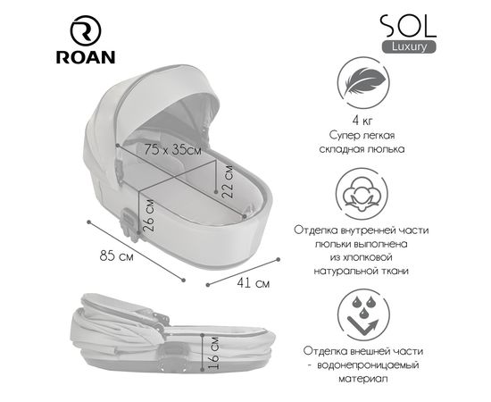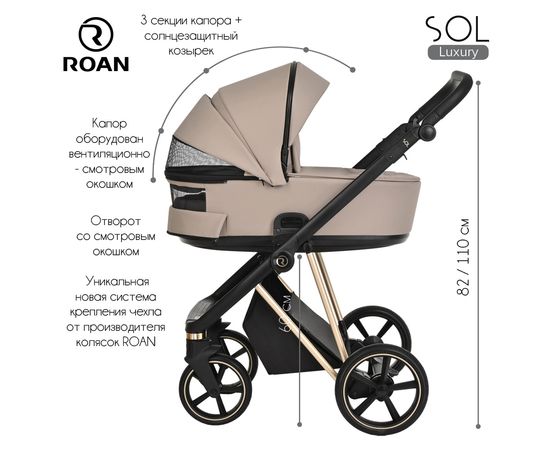 Многофункциональная модульная коляска Roan Sol Luxury– это детская коляска высокого качества в идеальном исполнении, которое заметно с первого взгляда.