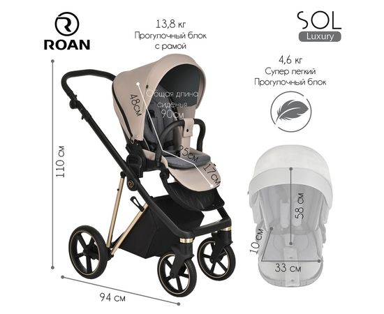 ROAN Коляска 2 в1 Sol Luxury короб + прогулка Sesame/Gold/руч.Черный(2 места)