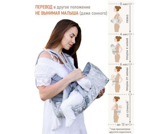 1. Многофункционален. Имеет шесть положений: "лежа" от 0 мес., "полулежа", "лицом к себе", "лицом от себя" и "за спиной".