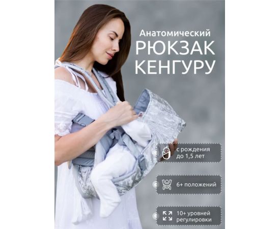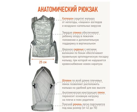 3. Анатомичен. Конструкция подвески для малыша снимает нагрузку с неокрепшего позвоночника и обеспечивает правильное положение с широким разведением ножек и без давления на промежность.