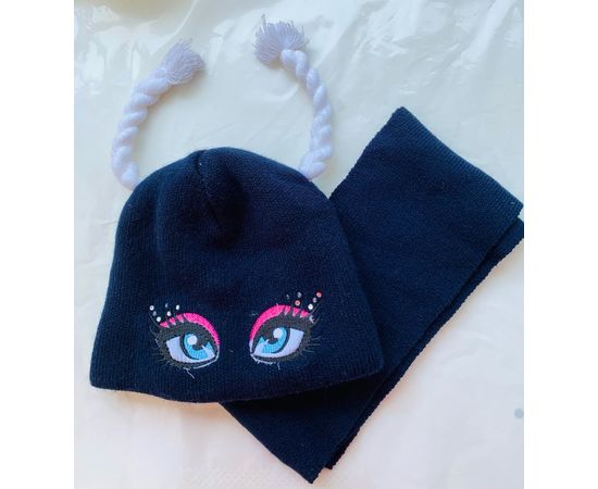Шапка 2в1 с глазками и косичками арт714 1-3 года - двойная, тепленькая, с веселыми косичками, идет в комплекте с шарфом под цвет. 100% акрил. Размер один: 1-3 года.
