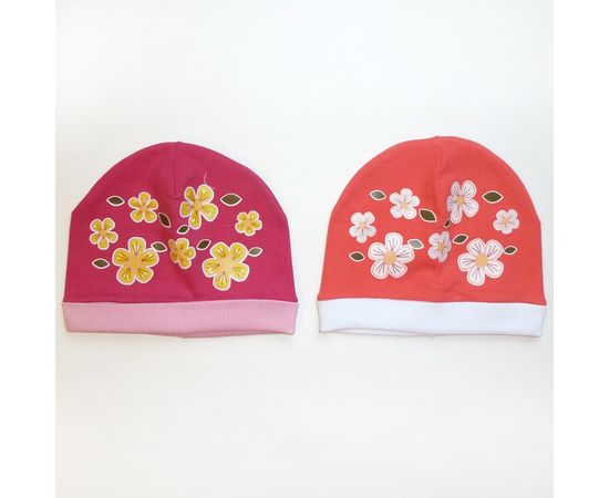 Шапка с цветами и трикотажным отворотом 1-3 года в ассортименте - отличные шапочки для непонятной погоды! Трикотажные, одинарные. Хорошо тянутся, красиво смотрятся! Различные цвета - желтый, розовый, красный, малиновый.