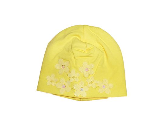 Шапка трикотажная желтая с мелкими цветочками 0-6мес - отлично на весну-осень. С красивой аппликацией в виде маленьких, нежных цветочков. Размер один: 0-6 мес.
