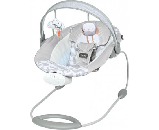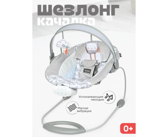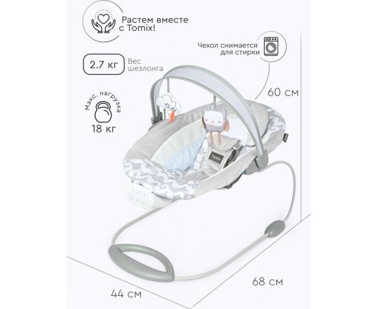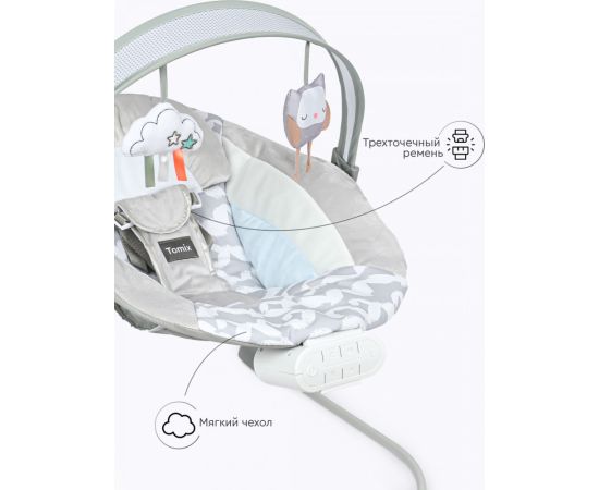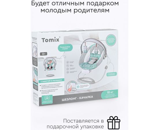 Детский шезлонг-качалка Tomix Rester – это незаменимый помощник для молодых родителей, который позволит вам освободить руки и обеспечить комфорт вашему малышу с самого рождения. Этот шезлонг оборудован специальной дугой с милыми игрушками, которые будут развлекать малыша, развивая его зрительное восприятие и моторику.