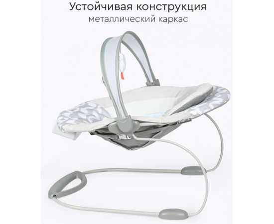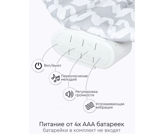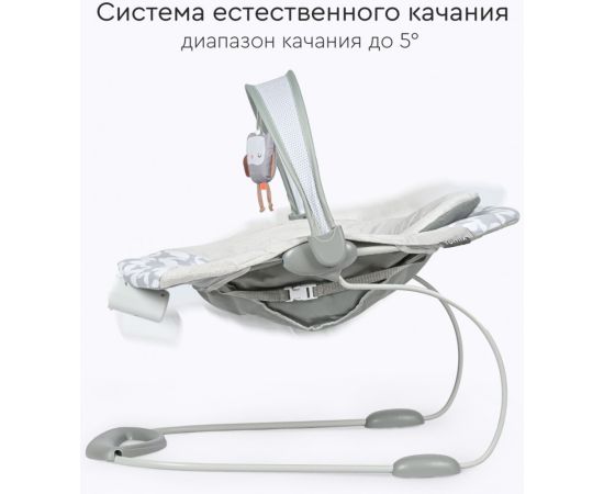Система естественного качания обеспечивает мягкое и плавное движение шезлонга, имитируя качание на руках у мамы, что помогает успокоить малыша и убаюкать его. У шезлонга предусмотрены режим прослушивания успокаивающих мелодий и режим вибраций, которые помогут малышу расслабиться и заснуть.