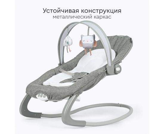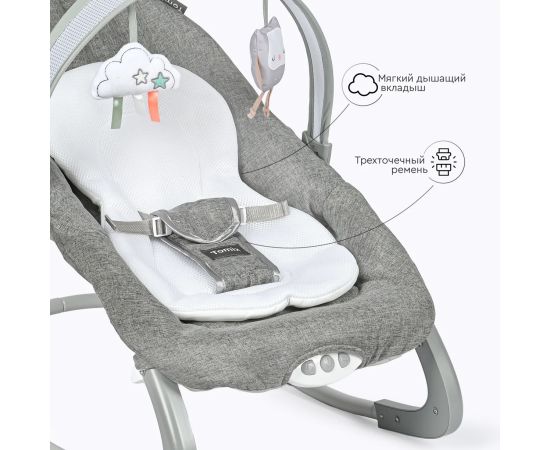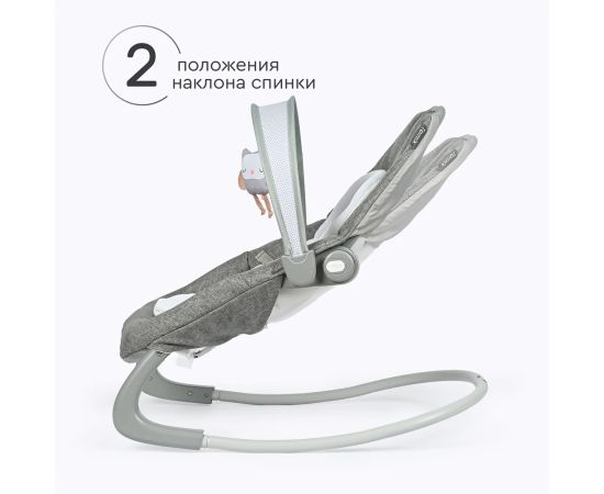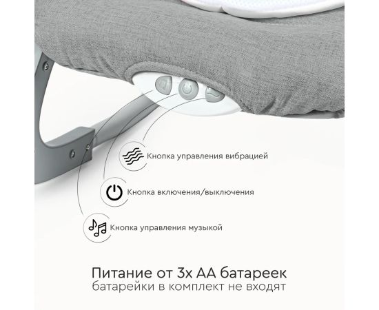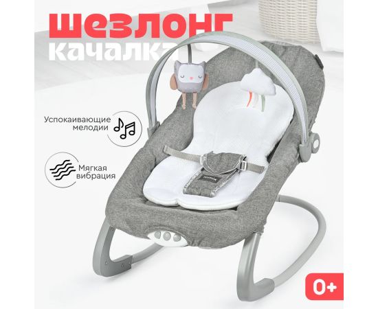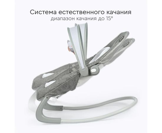 Система естественного качания обеспечивает мягкое и плавное движение шезлонга, имитируя качание на руках у мамы, что помогает успокоить малыша и убаюкать его. У шезлонга предусмотрены режим прослушивания успокаивающих мелодий и режим вибраций, которые помогут малышу расслабиться и заснуть.