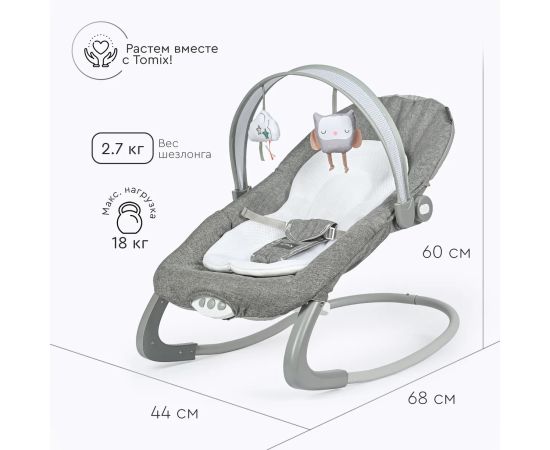 Детский шезлонг-качалка Tomix Sleeper – это незаменимый помощник для молодых родителей, который позволит вам освободить руки и обеспечить комфорт вашему малышу с самого рождения. Этот шезлонг оборудован специальной дугой с милыми игрушками, которые будут развлекать малыша, развивая его зрительное восприятие и моторику.
