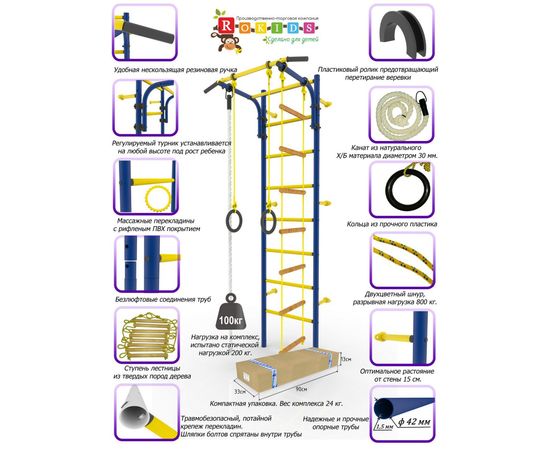 Каркас комплекс изготовлен из трубы диаметром 42 мм., покраска порошковая. Ступеньки – из трубы 25 мм, имеют массажное и противоскользящее ПВХ покрытие.