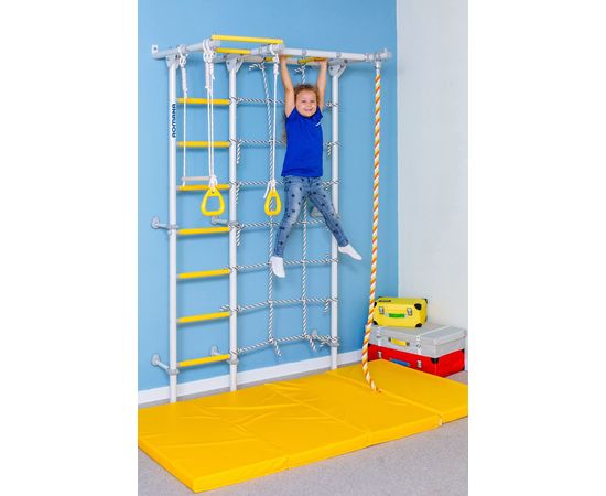 Здесь в наличии все, что нужно юному искателю приключений! В первую очередь у шведской стенки есть удобная лестница с массажными ступенями, к которой прилегает веревочный лаз, сделанный из шнура повышенной прочности.