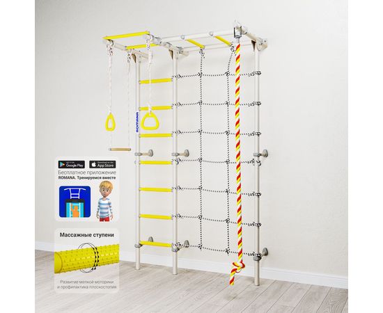 При кажущейся величине, комплекс ROMANA Karusel S7 спокойно устанавливается в большинстве квартир. Он занимает всего 1,2 метра в длину и разместится у любой свободной стены. Выбирайте из двух цветовых решений — новая гамма теплая, яркая, органично впишется в современный интерьер. Хороший выбор для ищущих что-то оригинальное для своих домочадцев. Скачайте для детей бесплатное приложение «ROMANA. Тренируемся вместе» и занимайтесь физкультурой в новом формате!