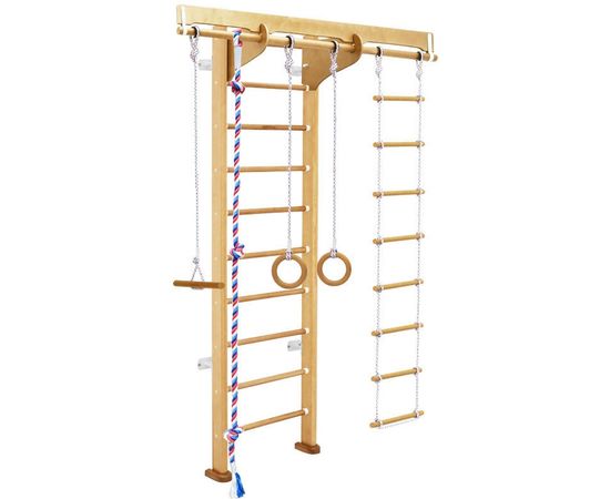 В комплекте: гимнастическая лестница, кольца, канат, тарзанка, веревочная лестница, 4 пристенных кронштейна,