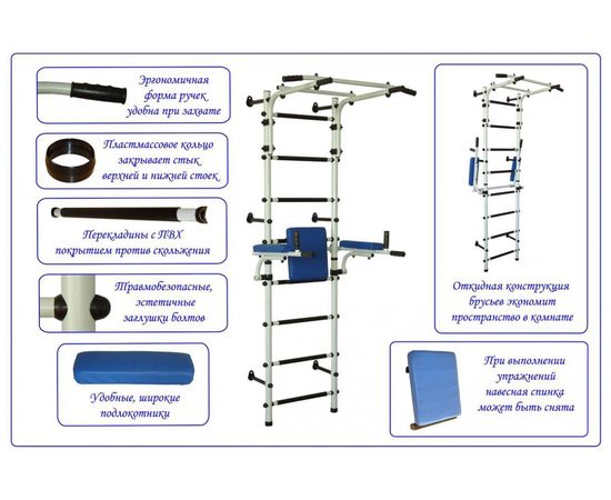 Комплектация: Турник на 2 вида захвата; Откидные брусья; Спинка для выполнения упражнений на пресс