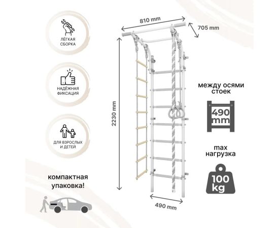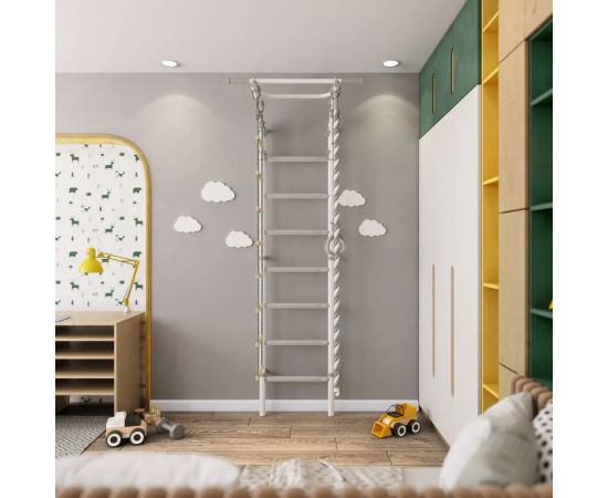 В детский спортивный комплекс входит навесное оборудование — веревочная лестница (может отличаться от фото и видео), канат, гимнастические кольца треугольной формы, которые не проворачиваются во время занятий.