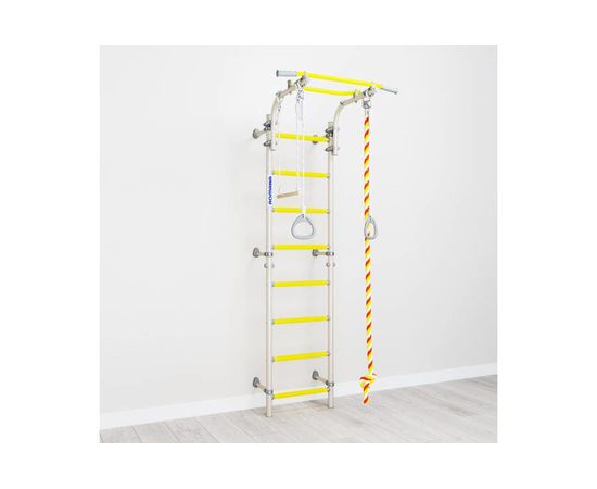 В комплексе ROMANA Next Top предусмотрены массажные ступени, которые хорошо развивают моторику и служат профилактикой плоскостопия. Также в комплекте идет навесное оборудование: кольца, трапеция и канат.