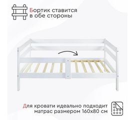 Кровать детская с бортиками 678001 Кровать детская с защитными бортиками от падения Бортик можно установить с любой стороны Ортопедическое ложе из ламелий Материал: Массив берёзы Спальное место: 160х80 см Цвет: белый Матрас в комплект не входит....