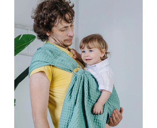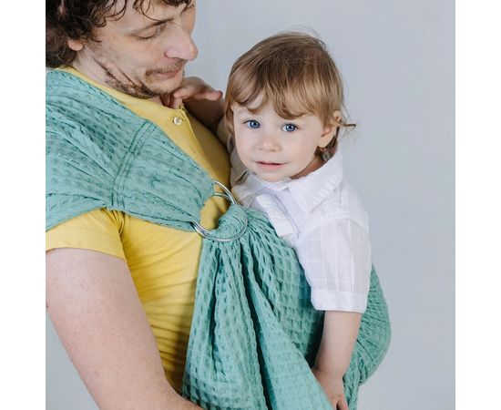 Мягчайший слинг для новорожденного из вафельной ткани. Ткань слинга имеет потрясающее диагональное движение нитей – лучше, чем у некоторых жаккардовых тканей. В слинг установлены самые надёжные кольца - сварные, стальные, никелированные. Даём гарантию, что они не расколются от неаккуратного обращения. Также это позволяет не увеличивать без нужды стоимость слинга.