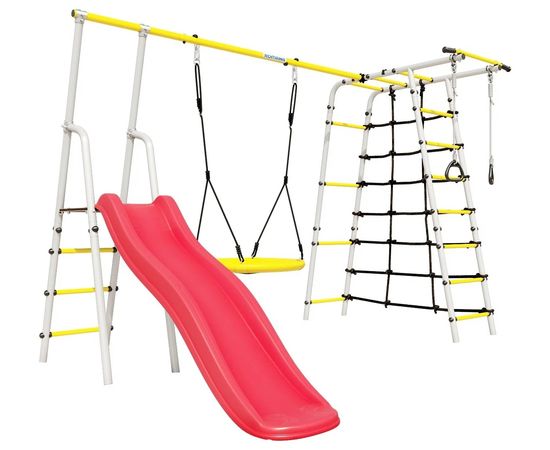 Дачный комплекс ROMANA Богатырь Плюс-2 103.12.05-01 с качелями-гнездом – это детский спортивно-игровой комплекс, который подойдет не только для дачного участка, но и для площадки в обычном дворе и для спортивной площадки в дошкольных и школьных заведениях. Дает ребенку начальную физическую подготовку, помогает развить ловкость и гибкость. В комплекте: лестница металлическая двойная П-образная с рукоходом, сетка для лазания, турник неподвижный, горка пластиковая, кольца гимнастические, качели гнездо.