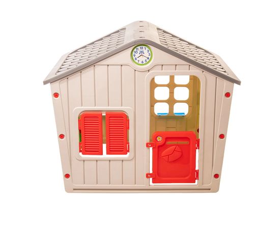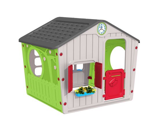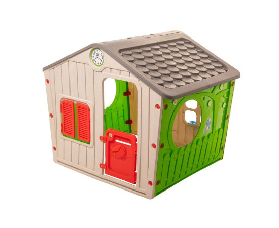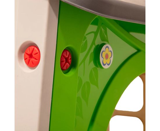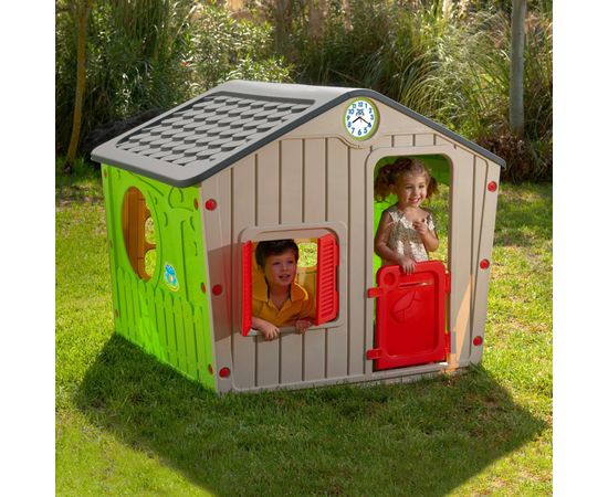Домик Galilee Village из яркого безопасного пластика оборудован дверкой и ставнями, которые можно открывать и закрывать в процессе игры.