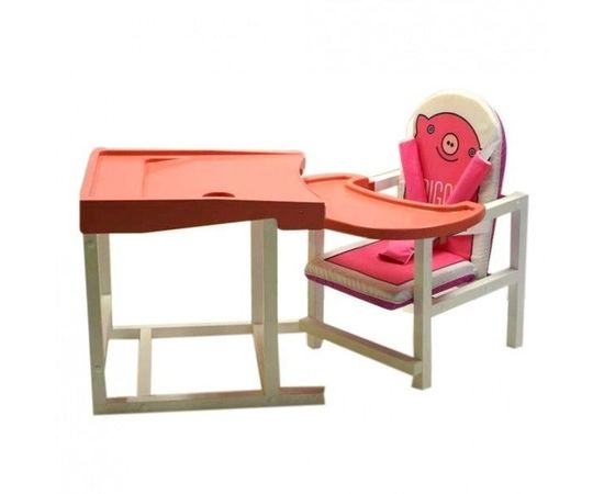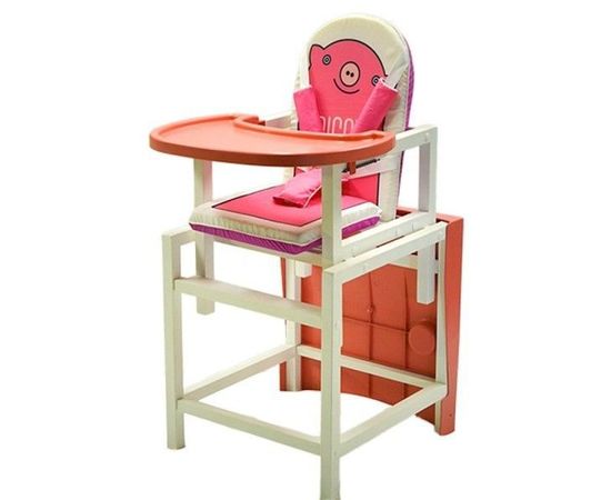 Такая многофункциональность данного изделия позволяет родителям сэкономить деньги на покупке дополнительной детской мебели. Выполнен стул-стол из натурального дерева с использованием пластмассовых и металлических вставок.