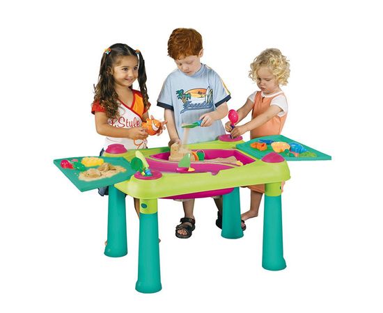 Детский Столик CREATIVE для творчества и игры с водой и песком - предназначен для игры деток возрастом от 2-х лет. Столик имеет 2 съемные емкости: одну для воды, вторую для песка, которые имеют объем по 15 литров, это позволит придумать малышам множество разнобразных игр. Столик имеет 4 формочки и крышки, что бы накрыть столик, когда детки играться не будут, а в открытом состоянии они могут использоваться как столешницы.