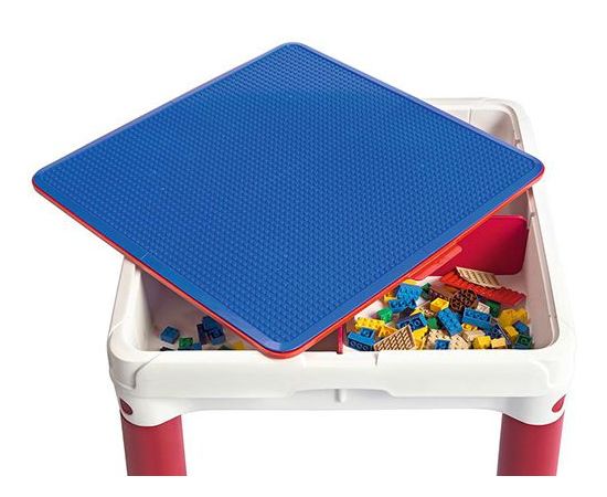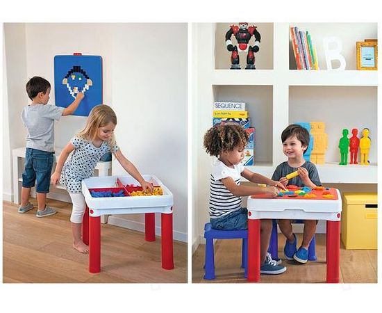 Детский Столик для игр с конструктором 3в1+2 табуретки (КОНСТРУКТОР В КОМПЛЕКТ НЕ ВХОДИТ), KETER - игровой стол 3 в 1, имеющий квадратную форму. Он оснащен съемной верхней панелью с двумя поверхностями: одна предназначена для игр с конструктором, а вторая – имеет гладкую структуру и используется для творческих занятий (рисования, лепки и другой деятельности). Также в комплекте присутствует 2 удобных табурета. В наборе имеется специальное приспособление для крепежа панели на стену.