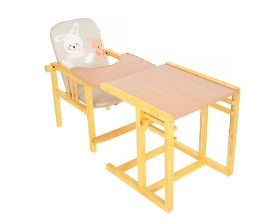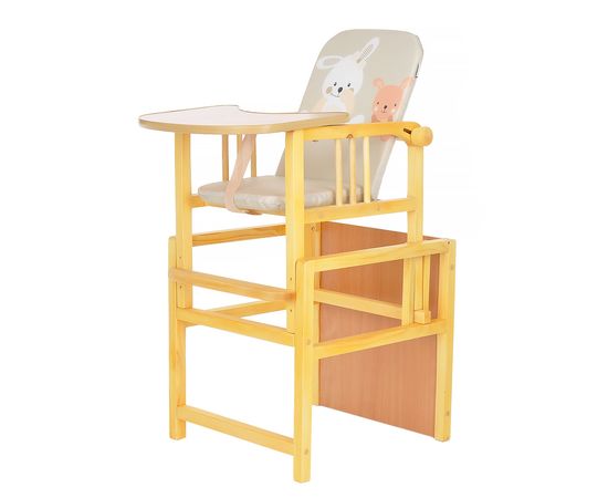 Надежный, крепкий и устойчивый каркас изготовлен из массива сосны и березы, покрыт несколькими слоями нетоксичного лака. Чтобы ребенок не сползал из кресла оно оснащено перемычкой между сиденьем и столешницей. Чехол сидения выполнен из моющегося материала.