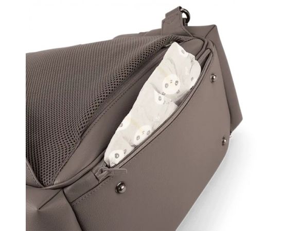 Роскошный многофункциональный рюкзак-сумка из эко кожи с множеством продуманных внешних и внутренних карманов и такими необходимыми аксессуарами, как пеленальный матрасик, органайзер для туалетных принадлежностей и отделение на спинке рюкзака для фиксации на чемодане.
