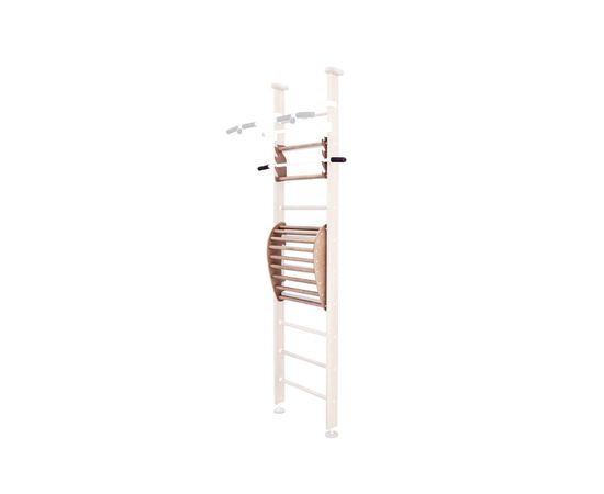 Подходит для детей в возрасте от 4 лет и рекомендован для установки в домашних условиях и в детских учреждениях. Конструкция была выполнена из натурального дерева, все края деталей немного скруглены, места креплений болтов закрыты декоративными пластиковыми заглушками обеспечивая большую безопасность для ребенка. Крепление: Турник и тренажер для спины могут устанавливаться на деревянную шведскую стенку на нужной высоте. Для напольных занятий тренажер также может быть установлен на ровную поверхность пола.