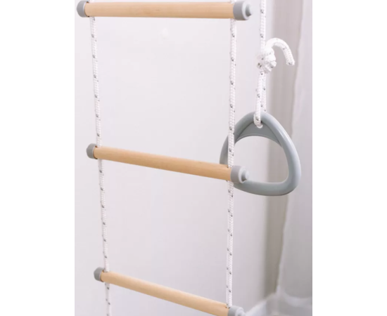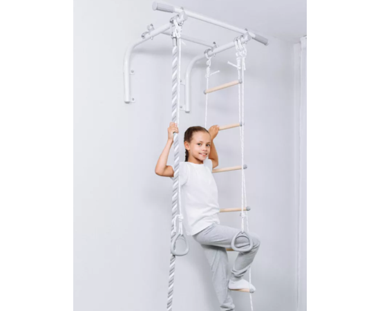 Турник оснащен игровыми элементами для всестороннего физического развития. Набор включает в себя: турник, канат, кольца, веревочную лестницу. Занятия на турнике способствуют укреплению мышц рук, спины, плеч и груди.