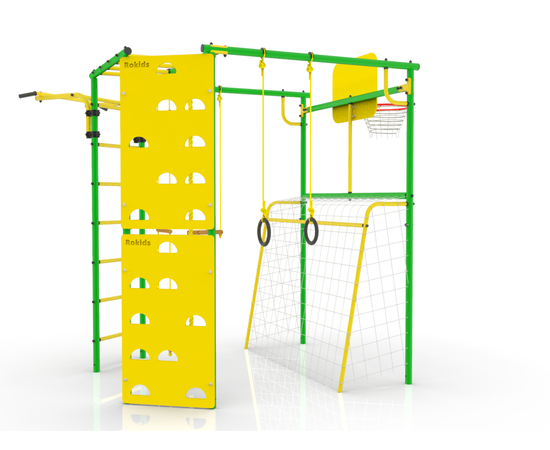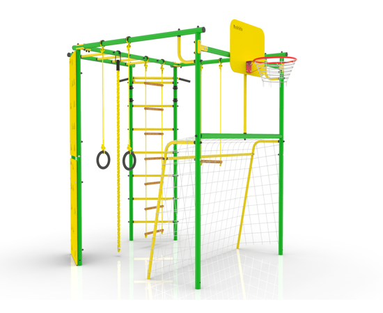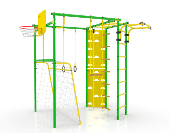 В комплектацию УДСК "Атлет-Т" входит: ворота, скалодром, трапеция, кольца гимнастические, канат, кольцо баскетбольное, лестница веревочная, турник, регулируемый по высоте, рукоход.
