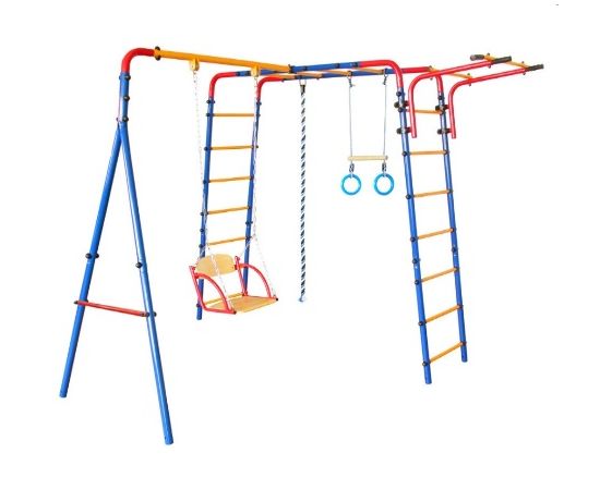 В комплекс входят: Кольца гимнастические, Канат, Рукоход, Шведская стенка, Регулируемый турник, Качели.