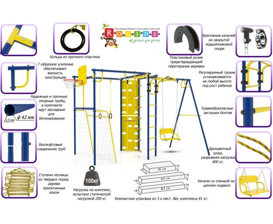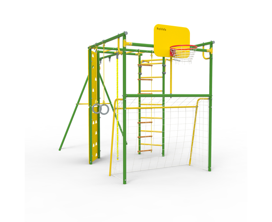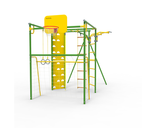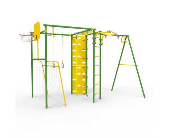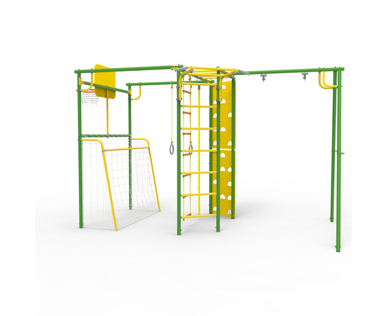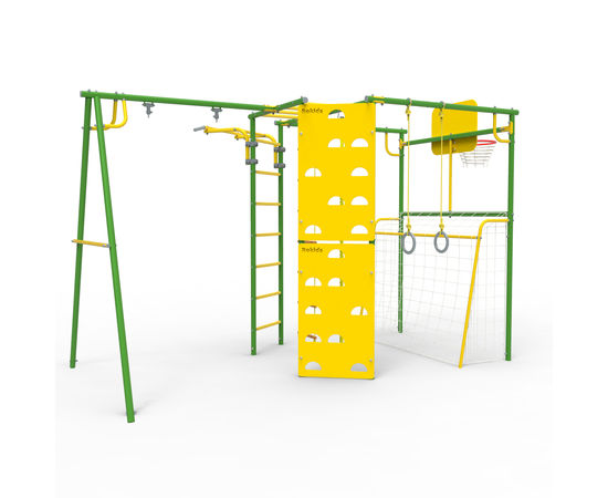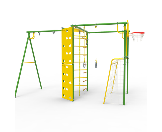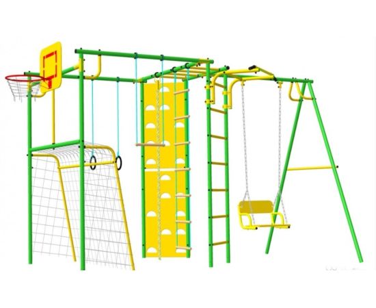 В комплектацию УДСК "Атлет-К" входят: рукоход, турник, регулируемый по высоте, ворота, качели со спинкой на цепях и подшипниках, скалодром, кольцо баскетбольное, кольца гимнастические, канат, лестница веревочная, трапеция, закладные для бетонирования.