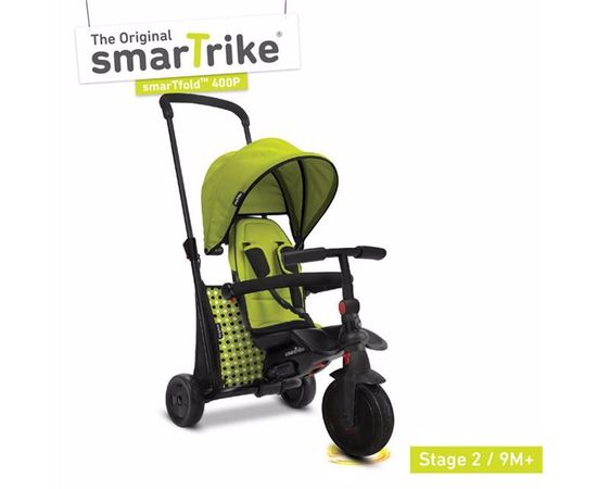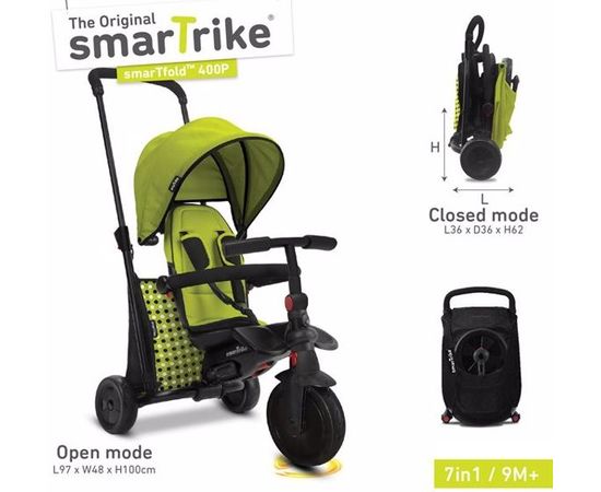 Уникальный в своем классе велосипед-коляска SmarTfold 400P 7 в 1 Green от знаменитого производителя Smartrike! Данная модель является отличной альтернативой коляске. Благодаря сплошной - усиленной ручке, велосипедом очень легко управлять. Преднее колесо с системой блокировки. Так же есть регулировка наклона руля. Большой козырек может полностью закрыть Вашего ребенка от солнца. Имеется складная подножка для ног. Для экономии места, данная модель компактно складывается по типу чемоданчика и помещается в сумку-чехол.