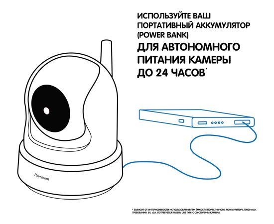 - Питание камеры (детского блока) возможно от сети или от обычного портативного аккумулятора (Power Bank, объём 10 000 mAh обеспечивает автономную работу камеры до 24 часов, продолжительность зависит от режима и интенсивности использования, разъём питания камеры USB Type-C, для подключения к портативному аккумулятору вам потребуется кабель с разъемом USB Type-C со стороны камеры);