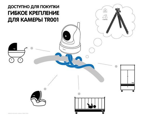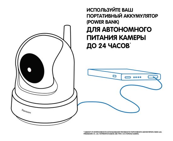 Камера оснащена мягким LED-ночничком, который можно включать удаленно. Обычно камеру видеоняни размещают на горизонтальной поверхности или на стене с помощью крепления из комплекта. Но производитель так же предусмотрел специальное отверстие с резьбой для штатива на дне камеры. Используя подходящий гибкий штатив (не входит в комплект), камеру видеоняни можно разместить, например, на элементах мебели или на ручке коляски. Родительский блок (монитор) уже оснащён ёмким аккумулятором. Во время прогулок и путешествий, где подключение к розетке невозможно, камеру видеоняни Ramicom можно подключать к вашему портативному аккумулятору (пауэр банку).
