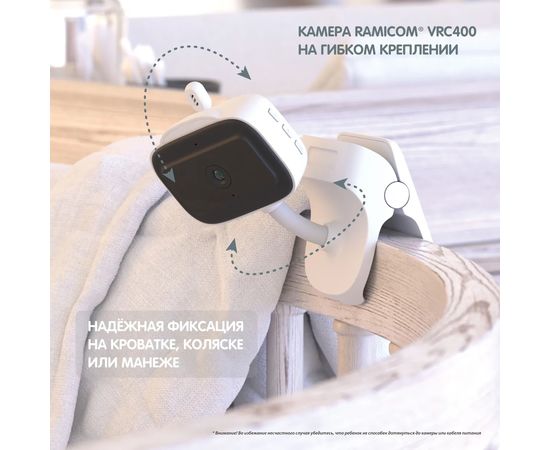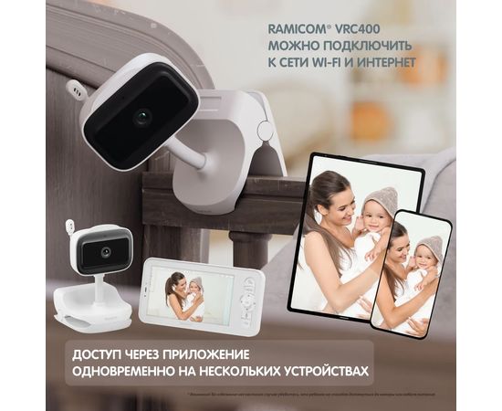 Ramicom VRC400 работает днем и ночью в режиме 24/7, непрерывно контролируя звук и движение в детской комнате, подавая сигналы оповещения родителям, если малышу потребуется их внимание. Видеоняня так же включает в себя ряд дополнительных полезных функций, например, таких как проигрывание колыбельных мелодий или таймер кормления. В камеру встроены датчики температуры и влажности, для контроля комфортной окружающей среды в комнате ребенка. С помощью Ramicom VRC400 можно записывать видео и фото, сохраняя в памяти одни из самых прекрасных моментов в жизни. На камере расположен симпатичный многоцветный ночничок, который, рассеивает по комнате мягкий свет, помогая крохе быстрее успокоиться и заснуть сладким сном.