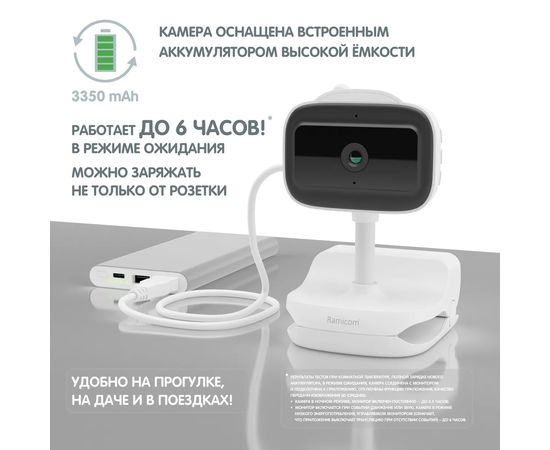 Видеоняня с аккумулятором в камере и креплением-прищепкой – надёжное цифровое устройство с большим дисплеем 12,7 см от известного производителя высококачественной электроники для удаленного присмотра за ребенком. Особенность данной модели заключается в камере, которая может крепиться практически к любым предметам, как прищепка, например, на элементах мебели или ручке коляски. Аккумуляторы большой ёмкости встроены и в камеру, и в монитор. Так что родители могут комфортно, без подключения к внешнему источнику питания, пользоваться данной видеоняней Ramicom дома и во время прогулок.